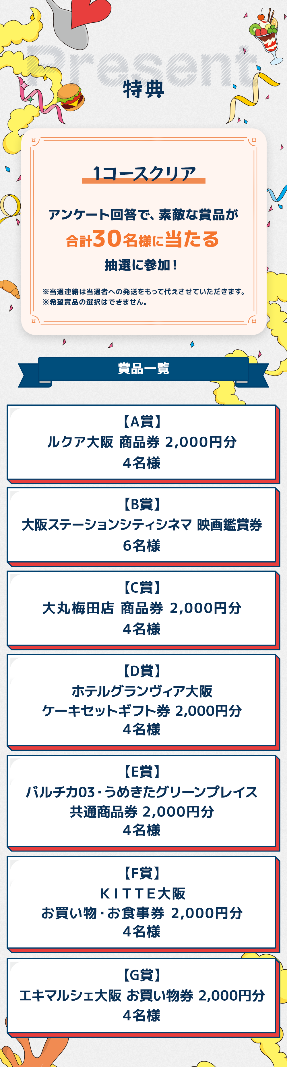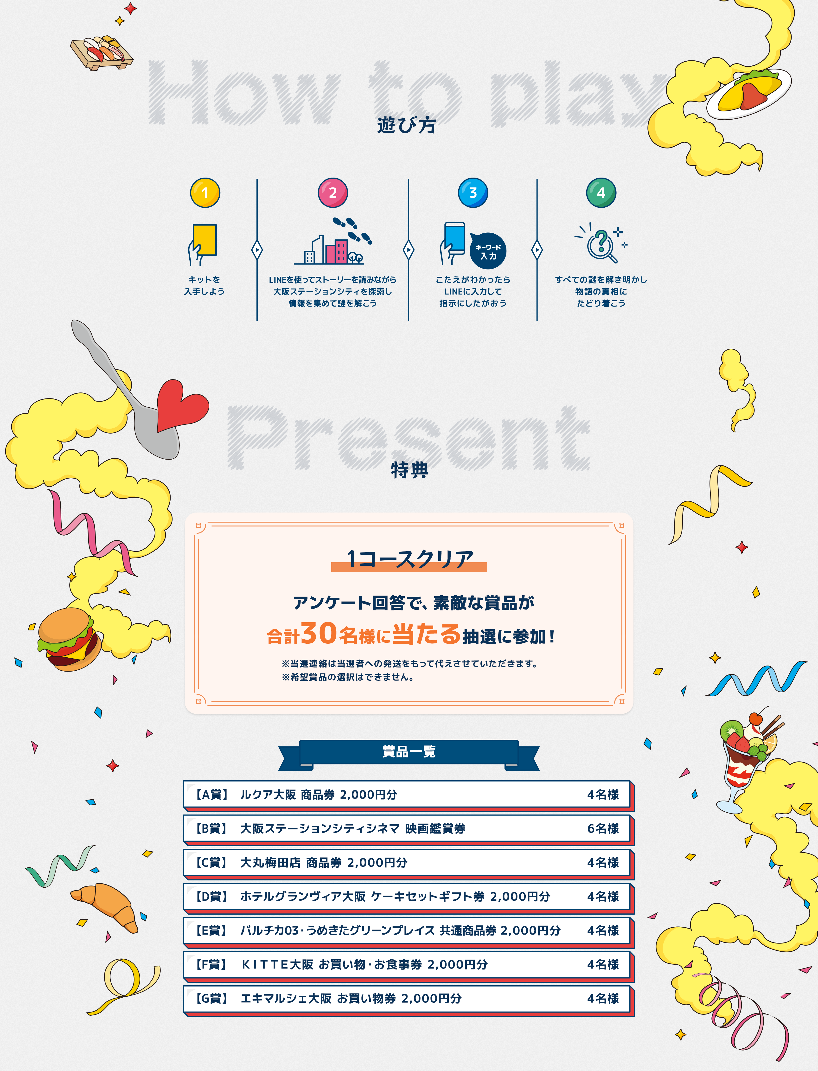 本キャンペーンは、エントリー期間中に「おいしすぎる街からの脱出」の謎解き冊子キットを入手し、1コースクリアもしくは完全クリアし、クリア者専用の応募フォームからアンケートに回答してご応募いただいた方の中から抽選で30名様に賞品をプレゼントするキャンペーンとなります。アンケートを入力した方で完全クリアした方は自動的に当選確率が2倍になります。